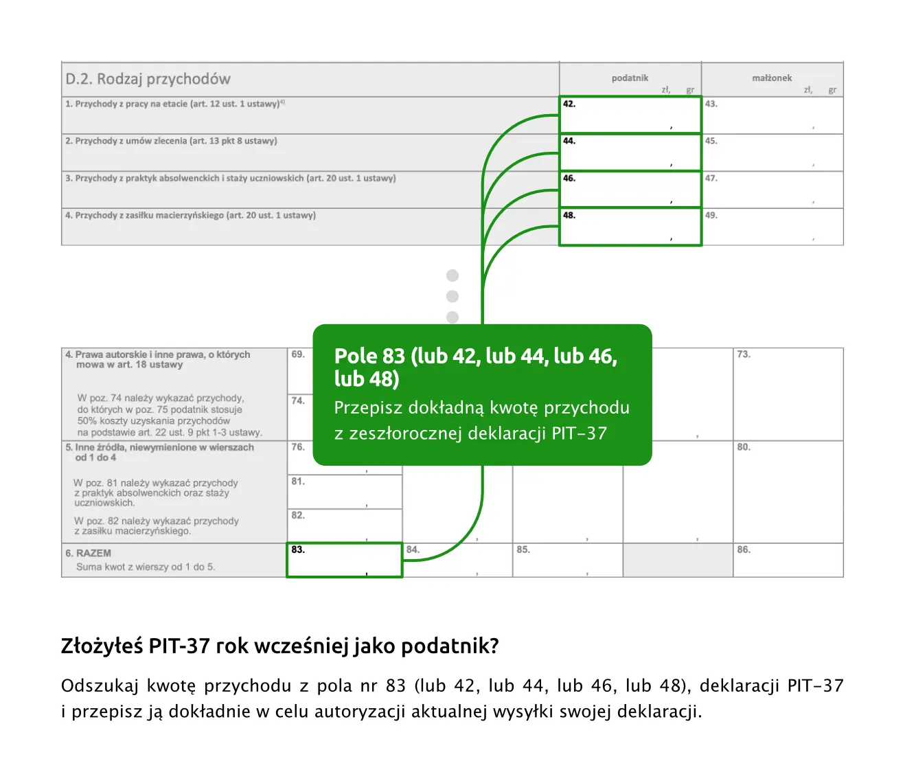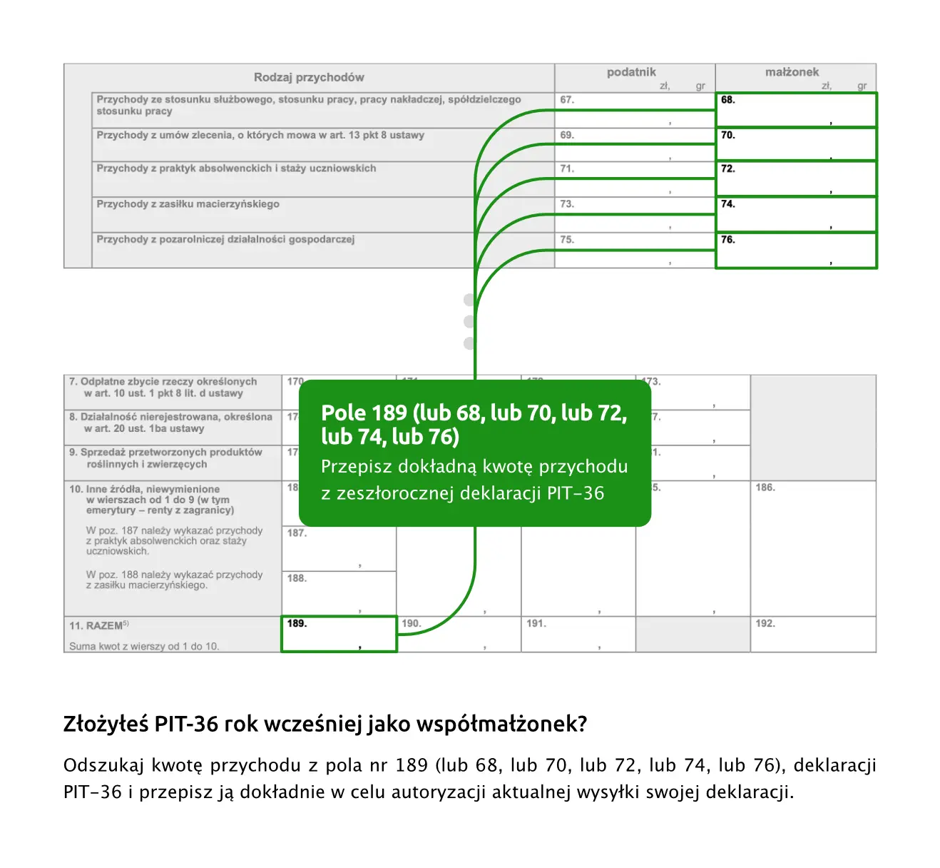 Jeśli w zeszłym roku ten podatnik był wpisany jako małżonek - należy oczywiście wpisać dane przychodu z sekcji małżonka.