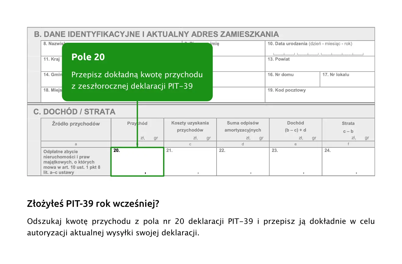 Następnie należy poszukać deklarację roczną, którą składała ta sama osoba (firma) za rok 2024. Jeśli ta osoba (firma) składała kilka deklaracji np. PIT-37 (lub PIT-36) i PIT-38, należy poszukać jedną dowolną z tych deklaracji - nie wolno sumować kwot przychodów z kilku deklaracji!
