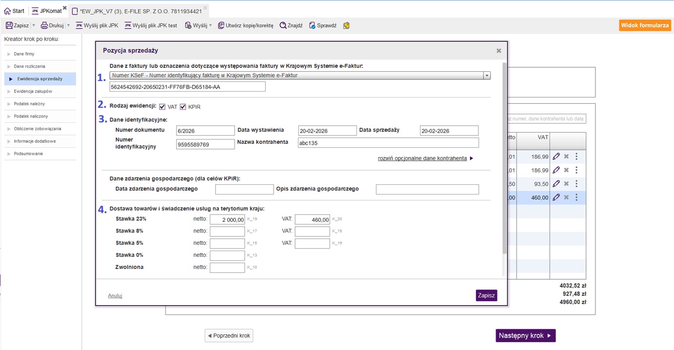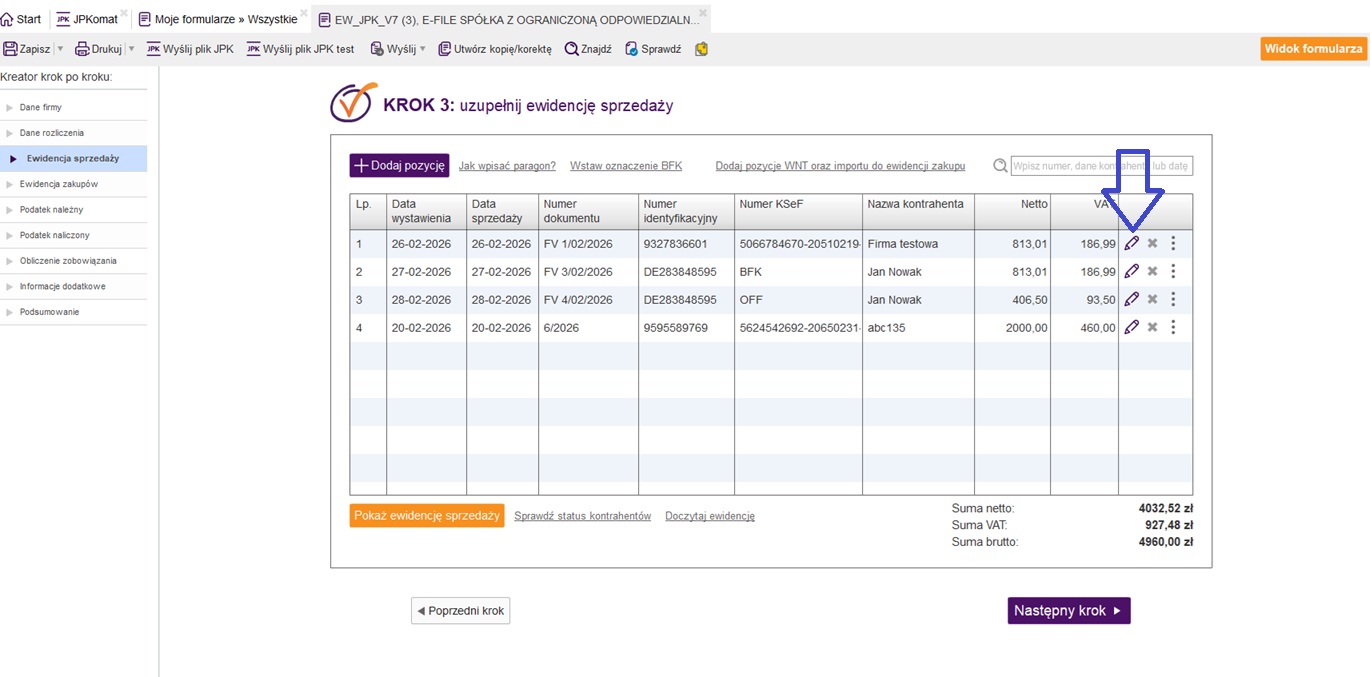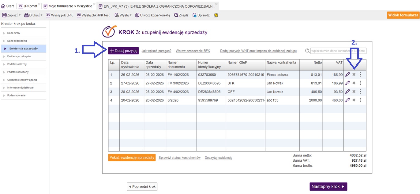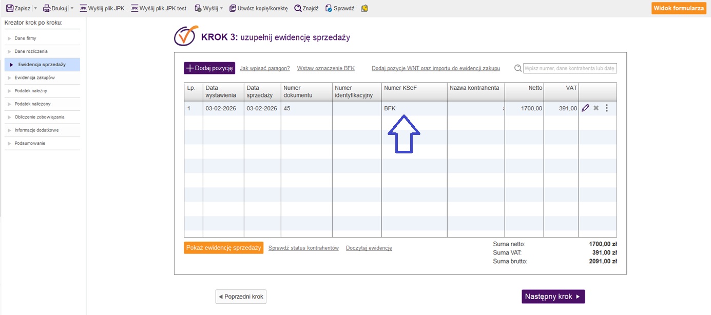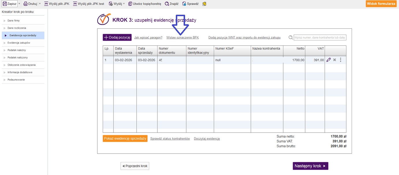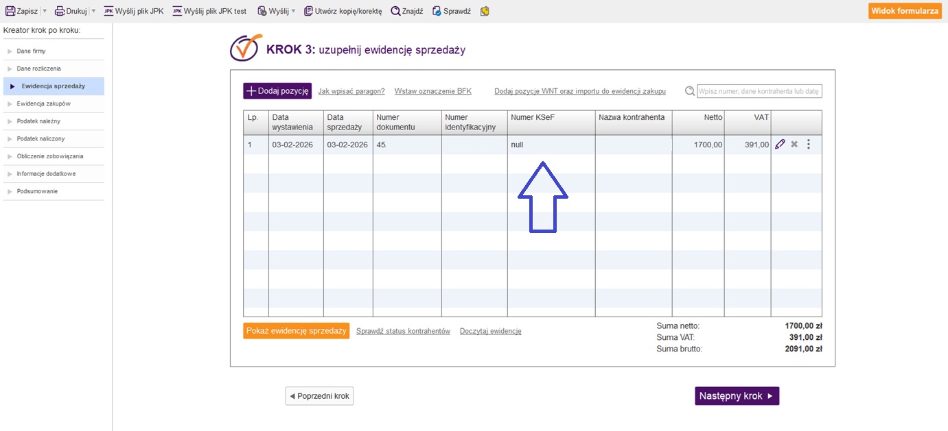 Krok 3 – uzupełnienie ewidencji sprzedaży