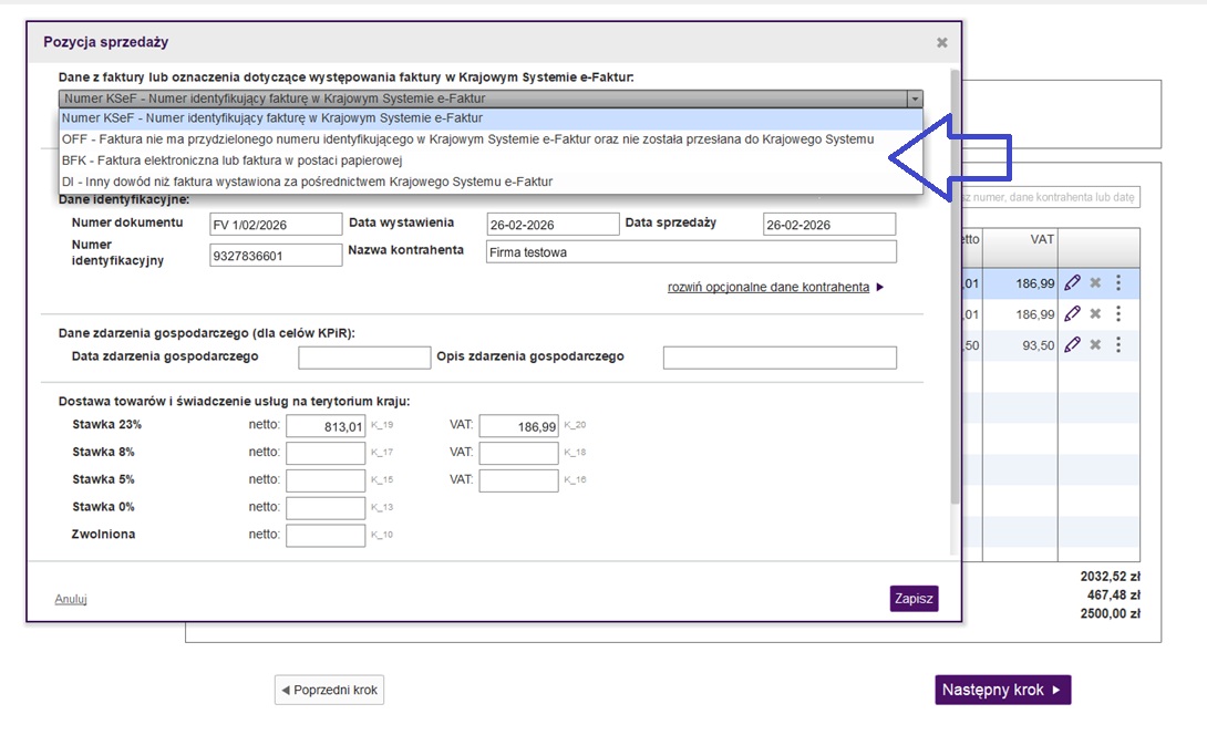 Wybrane przez nas oznaczenie: Nr KSeF, BFK, OFF, DI pojawi się w ewidencji JPK w kolumnie “Numer KSeF’.