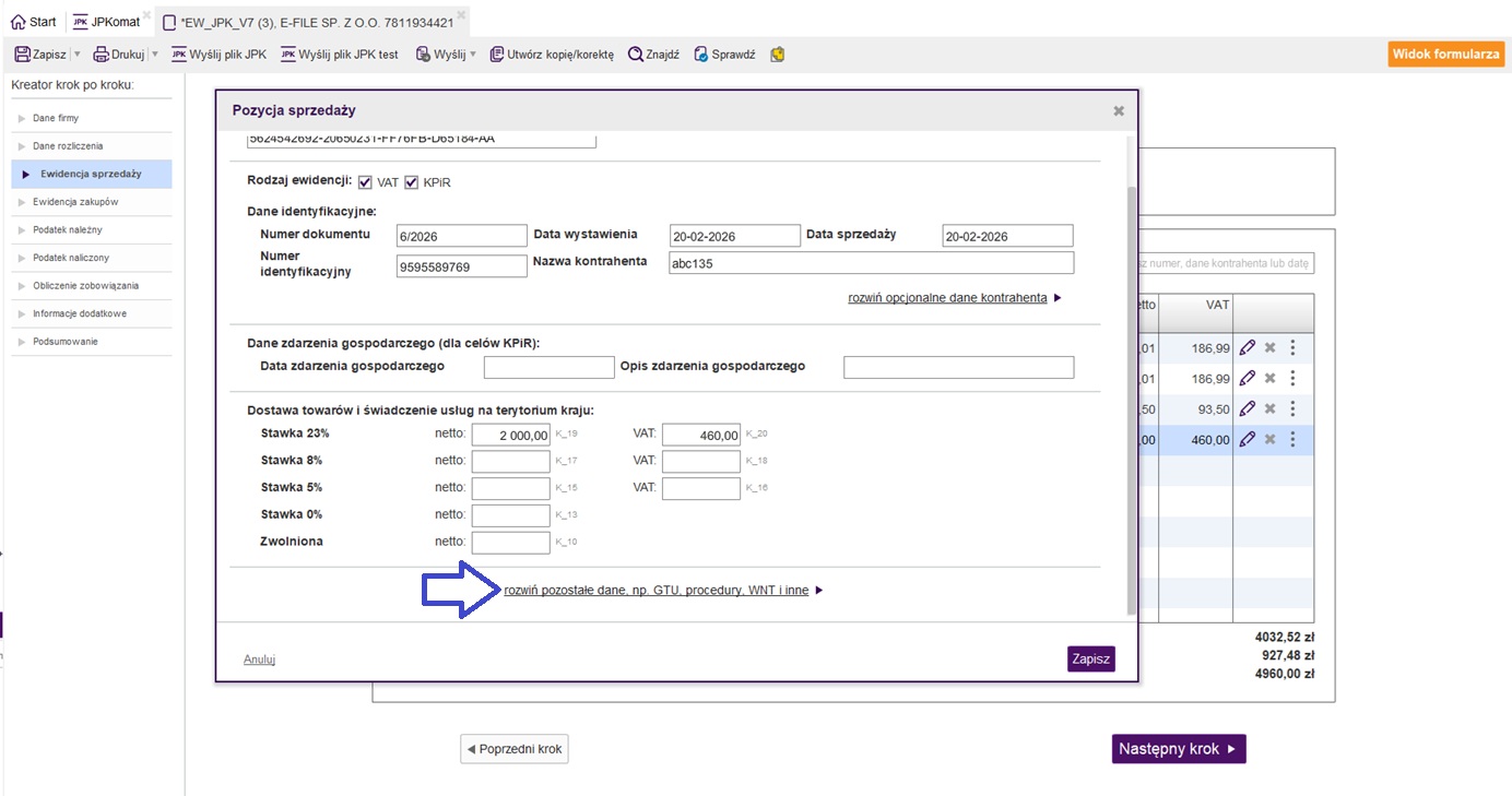 W tej części możemy uzupełnić pozostałe dane w tym GTU, procedury oraz inne pola, a wypełnione przez nas pozycje trafią do ewidencji rozszerzonej JPK_V7.