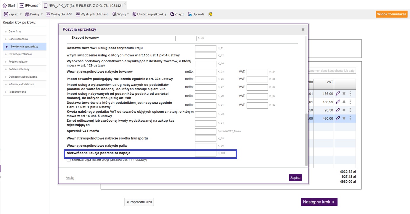 Jest tu również dostępne nowe pole ‘Niezwrócona kaucja pobrana za napoje’.