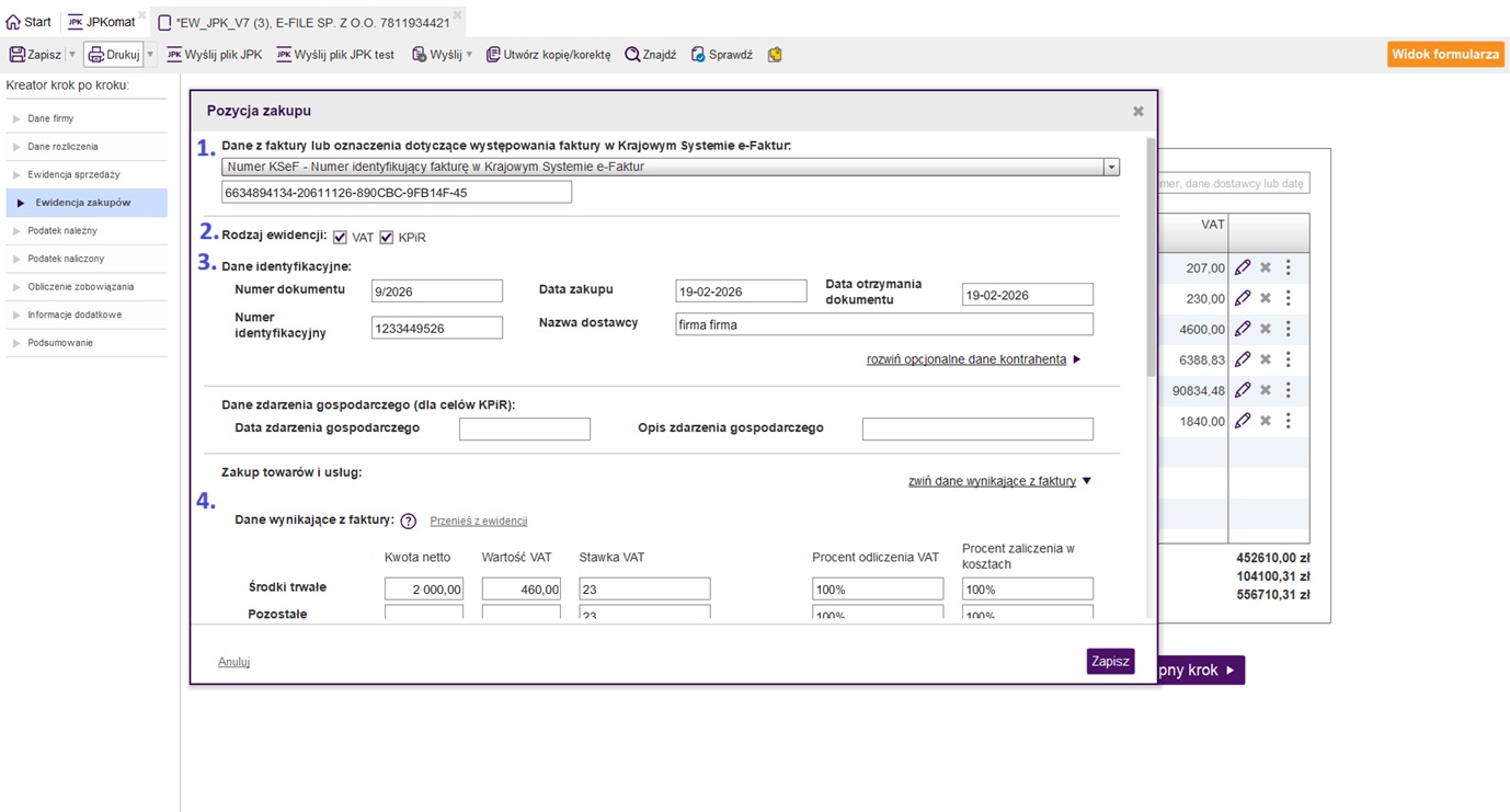 Chcąc dodać nową pozycję do ewidencji zakupu, wypełniamy numer KSeF (lub wybieramy z listy inne oznaczenie) (1), wskazujemy rodzaj ewidencji (2), dane identyfikacyjne (3) oraz kwoty netto i VAT (4).