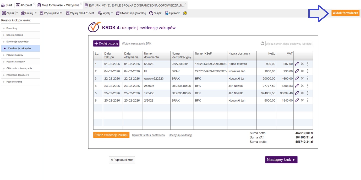 W każdej chwili można z podglądu ewidencji sprzedaży wrócić do Kreatora klikając na przycisk ‘Widok kreatora’.