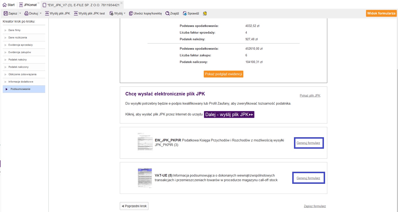 W tym kroku również możemy wygenerować PKPiR oraz VAT-EU klikając 'Generuj formularz'.