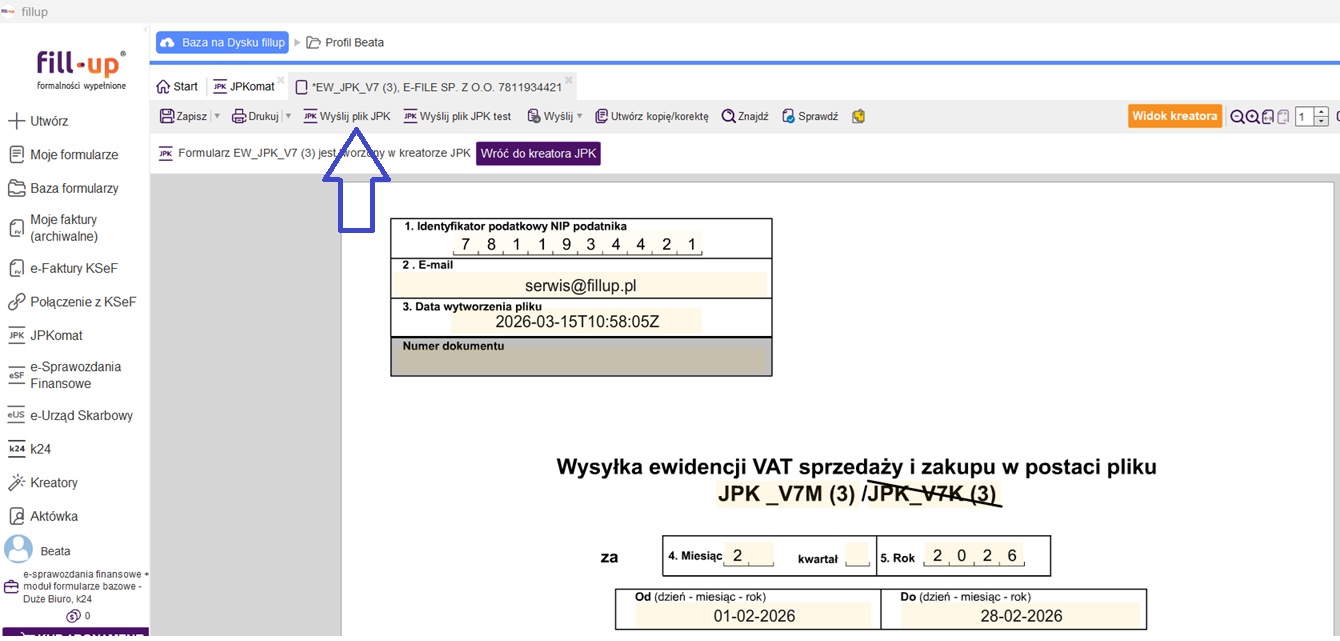 Od wersji programu fillup 8.3 dostępny jest kreator JPK_V7M i kwartalny JPK_V7K w wersji 3. Nową wersję pliku JPK_V7 (3) należy stosować od plików JPK składanych za luty 2026 roku.