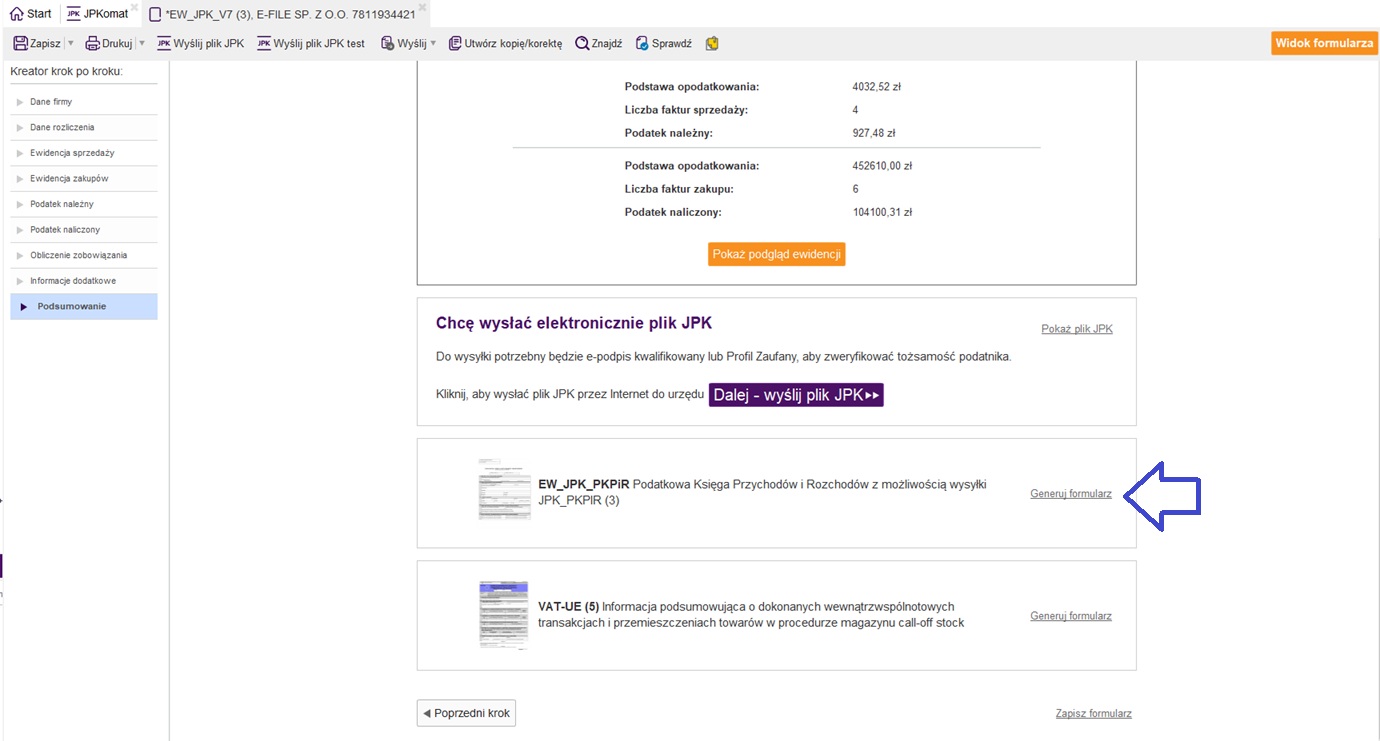 Po wysyłce pliku JPK możemy w każdej chwili wrócić do Kreatora do okna kroku 2 i zaznaczyć, że chcemy wygenerować formularze PKPiR lub VAT-UE (5), po przejściu do kroku 9 program pozwoli na ich wygenerowanie na podstawie danych, które były wprowadzone w JPKomacie.