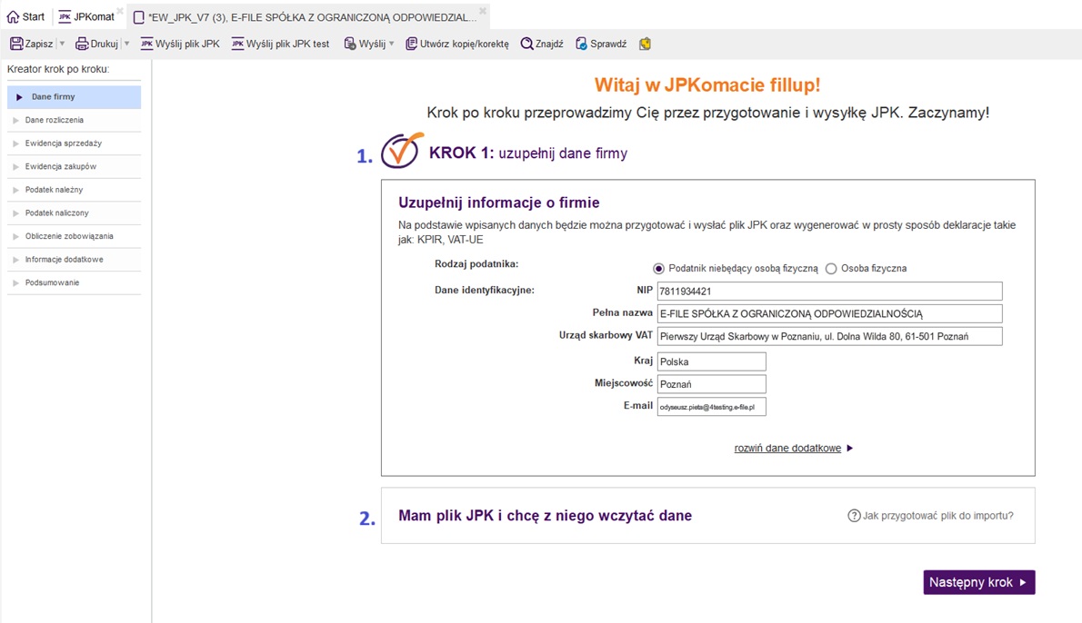 Po uzupełnieniu wszystkich danych, przechodzimy dalej klikając w dole okna na przycisk ‘Następny krok’.