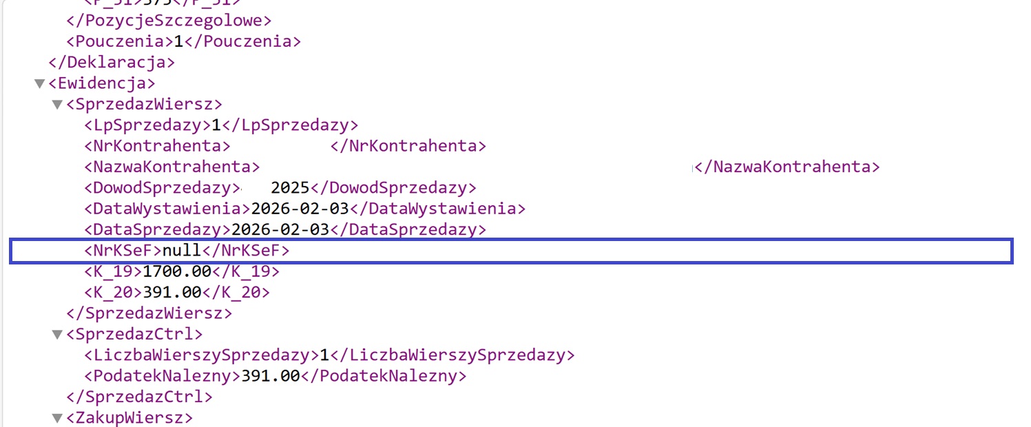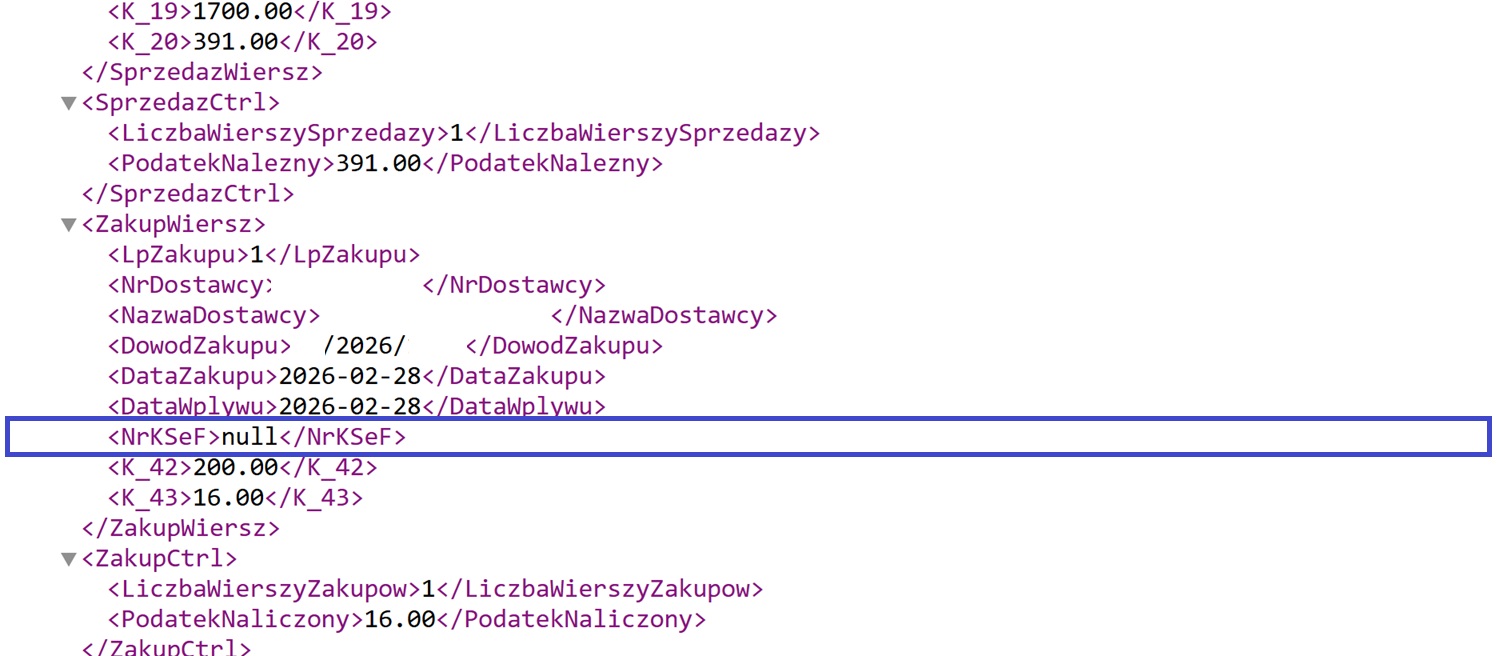 Jeśli importowaliśmy gotowy plik XML JPK_V7 przygotowany w innym programie lub we wcześniejszej wersji schemy JPK_V7 (2), to również w ewidencji zakupu mogą pojawić się nieprawidłowe pozycje ‹NrKSeF›null‹/NrKSeF› w kolumnie nr KSeF i może pojawić się problem z wygenerowaniem i wysyłką pliku JPK. Przyczyną mogą być nieprawidłowe parametry ‹NrKSeF›null‹/NrKSeF› wpisane w pozycji Nr KSeF - w pliku XML będzie to widoczne jako ‹NrKSeF›null‹/NrKSeF›.