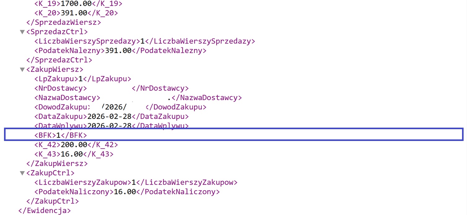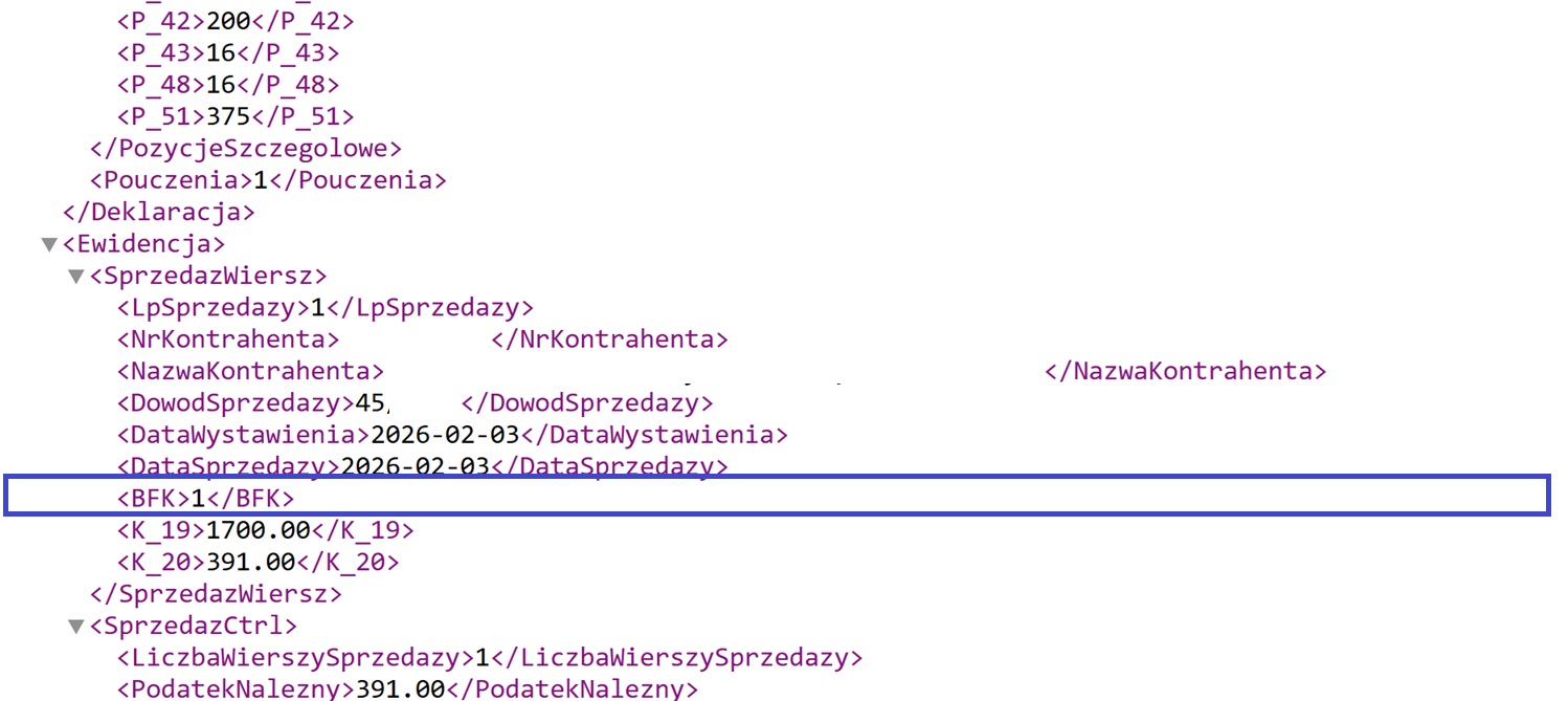 Po przejściu dalej będzie można sprawdzić, czy plik XML JPK wygenerował się już poprawnie. W pliku XML będzie to widoczne już poprawnie jako ‹BFK›1‹/BFK›.