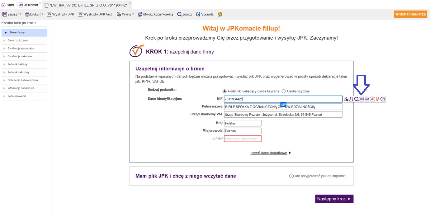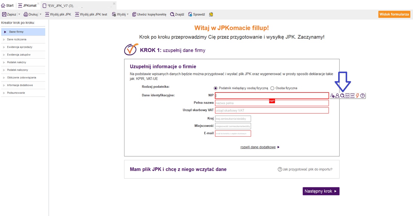 Chcąc wypełnić plik JPK dla zupełnie nowej firmy, można pobrać jej dane z GUSu, podając NIP i klikając w ikonę ‘GUS’.