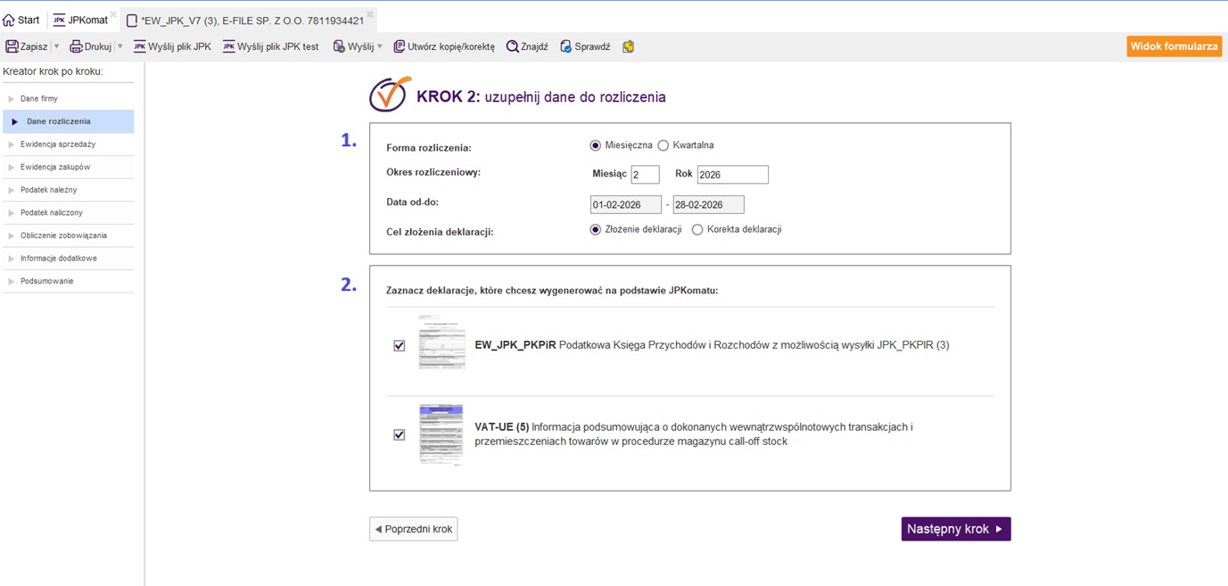 Po wysyłce pliku JPK_V7 możemy w każdej chwili wrócić do Kreatora do okna kroku 2 i zaznaczyć, że chcemy wygenerować formularze PKPiR lub VAT-UE (5), po przejściu do kroku 9 program pozwoli na ich wygenerowanie na podstawie danych, które były wprowadzone w JPKomacie.